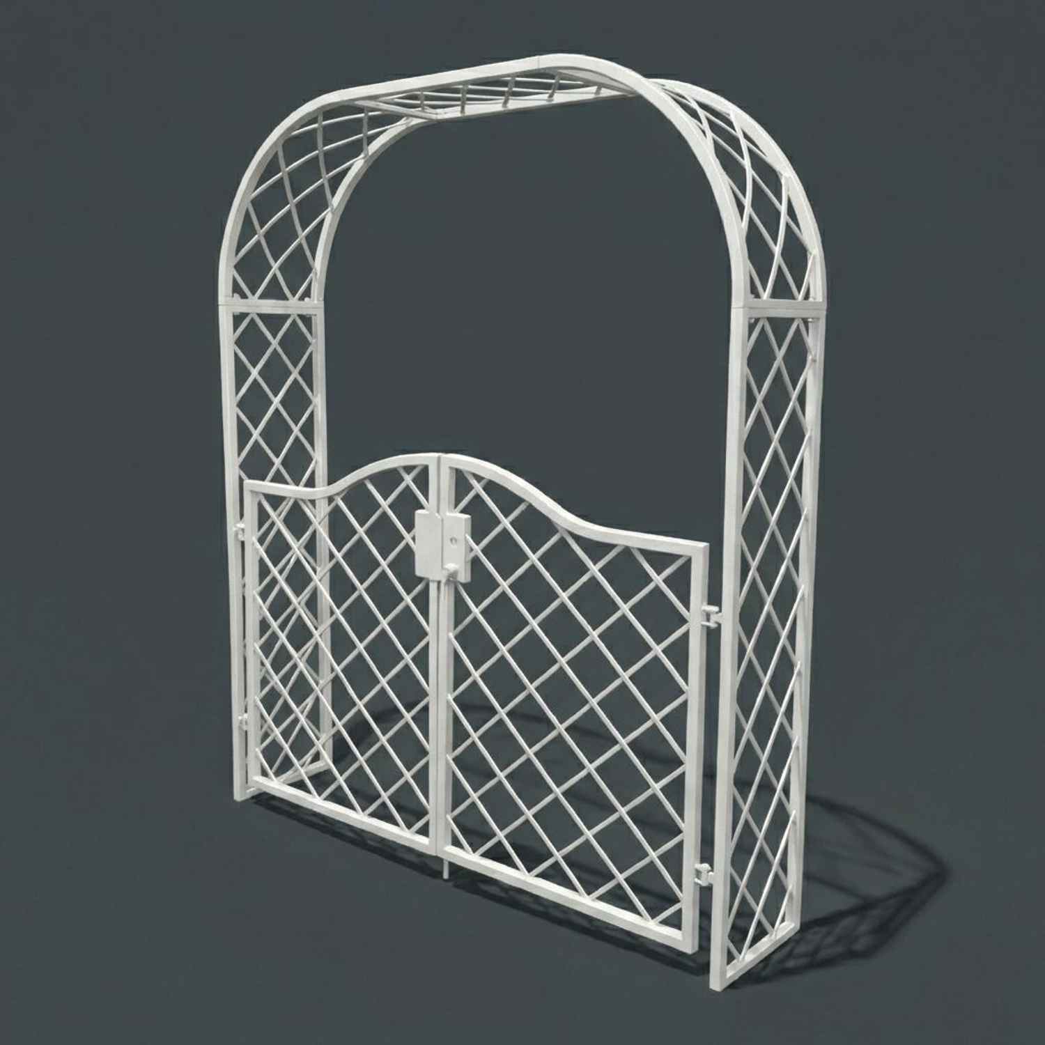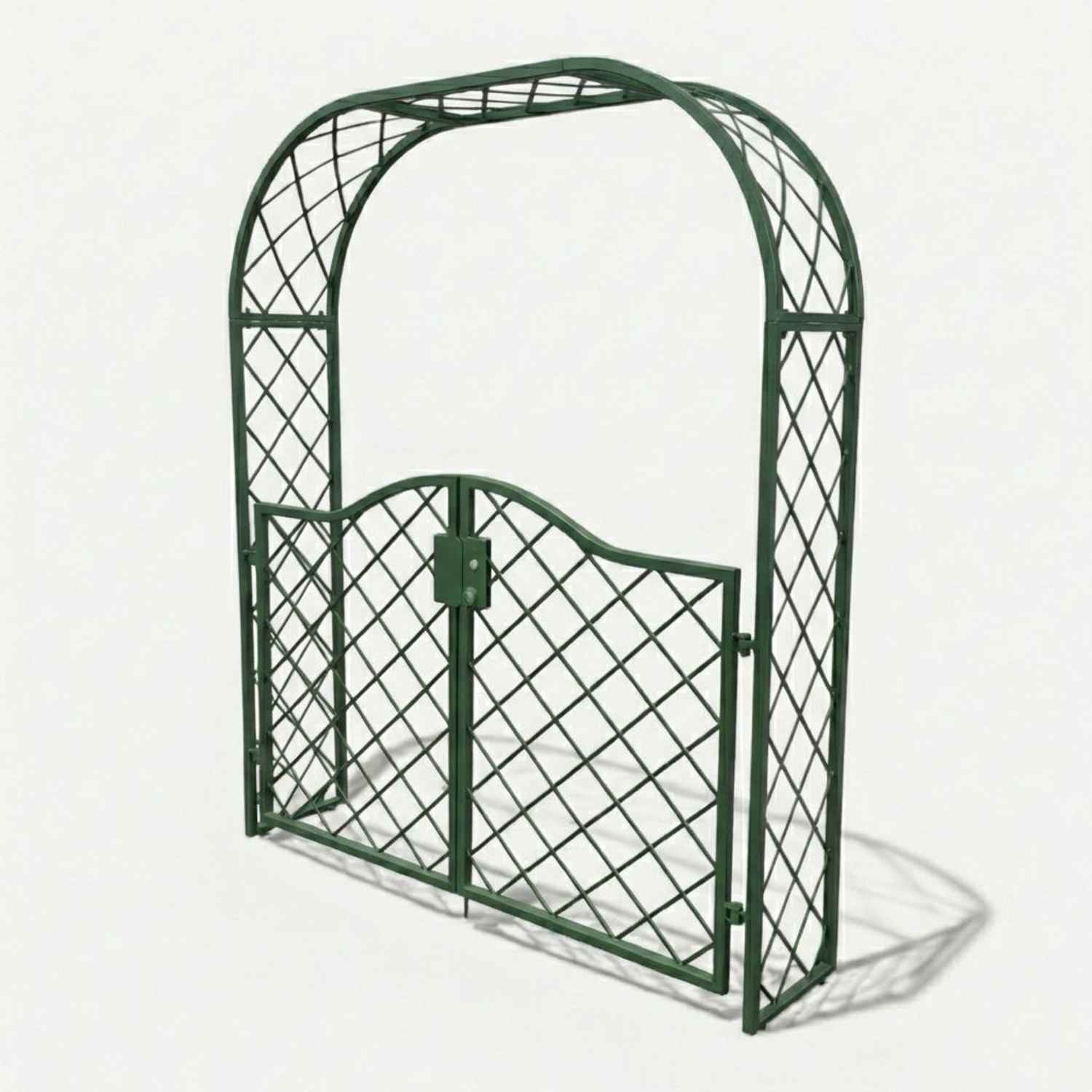 Rundbogen Rosenbogen und Gartentür aus Kastenrohr und dekorativem Rundbogen.