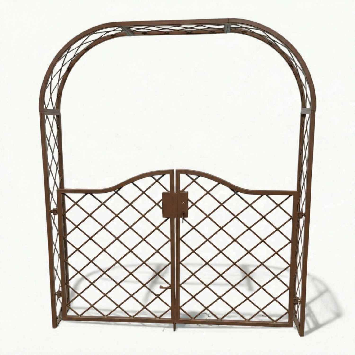 Lieferumfang: 1 Stck. Rosenbogen-Tür Bozen-RB 170 RBS, 220 cm hoch, bestehet aus 2 Seitenteile und 2 Bögen, 2 Türen mit Schloss/Gegenkasten, 4 Erdspiesse M20 ,Montagefertig