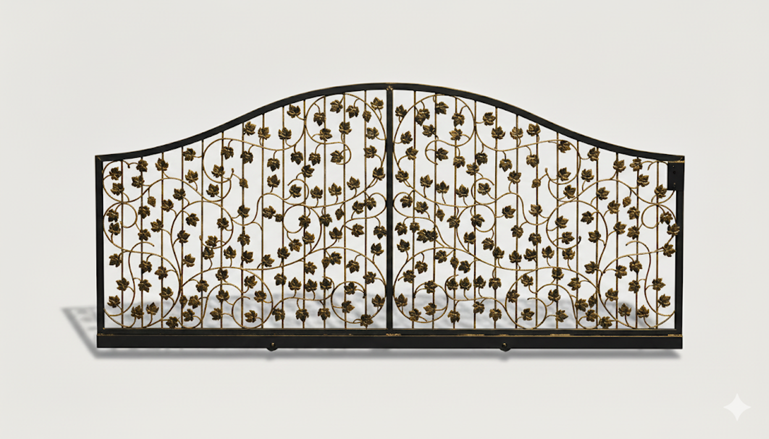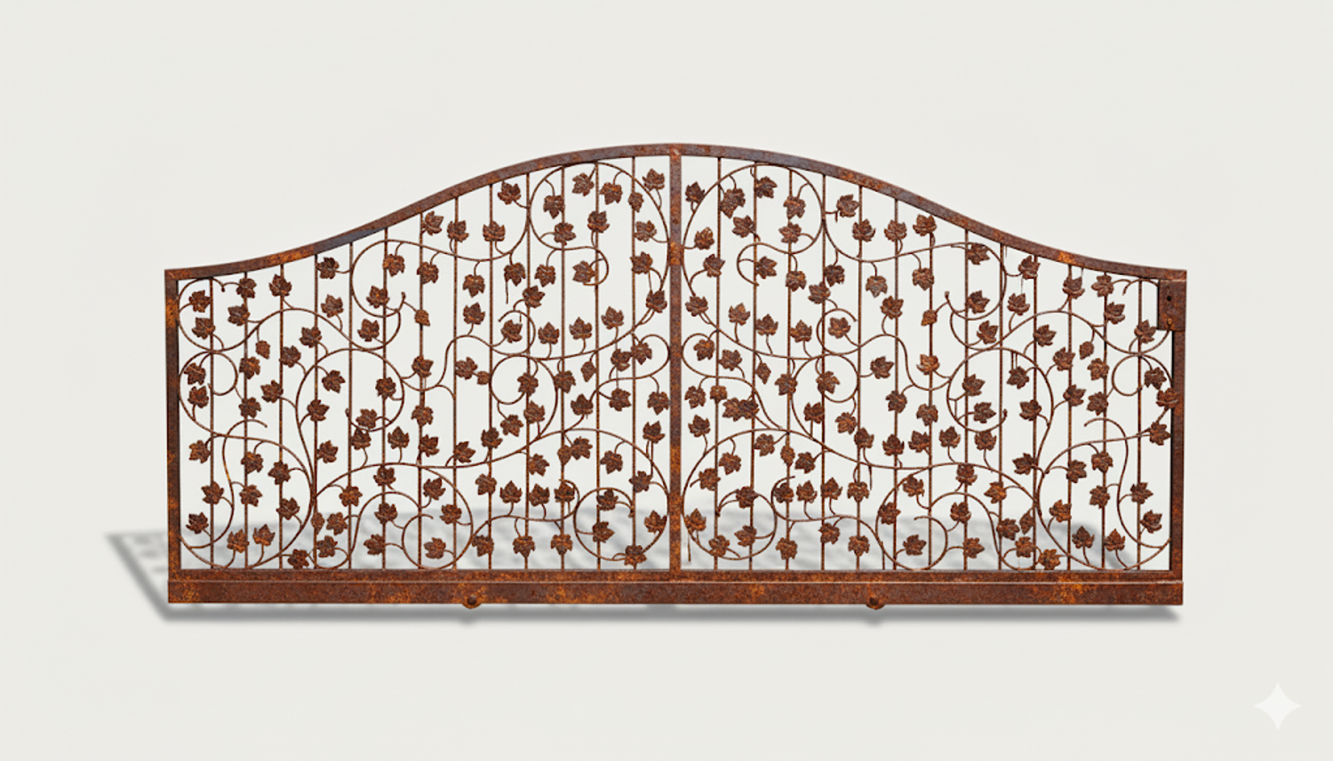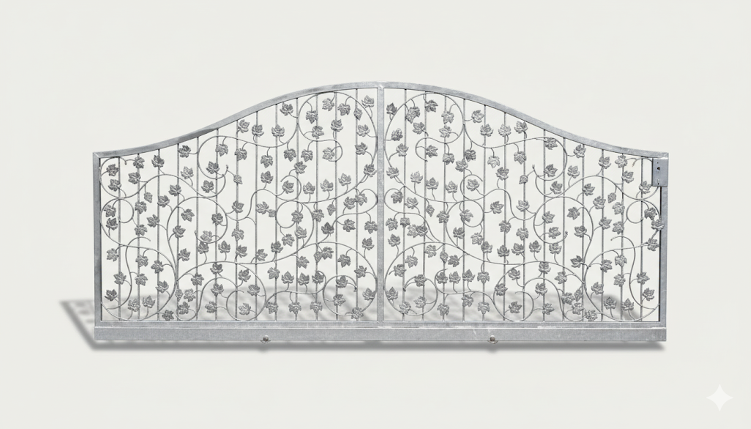Dekoratives Eisenwerk mit filigranen Metallblech-Elementen künstlerisch aufwendig und sauber von Hand gearbeitet. Beeindruckende Gesamterscheinung mit Dominanz der stilisierten Blätter und Weinreben. Schwungvoll harmonisch wirkt auch der obere Rundbogen. Besonders aufwendig und auffällig sind die filigranen geschmiedeten Weinstöcke aus Rundeisen mit geschmiedeten Enden.