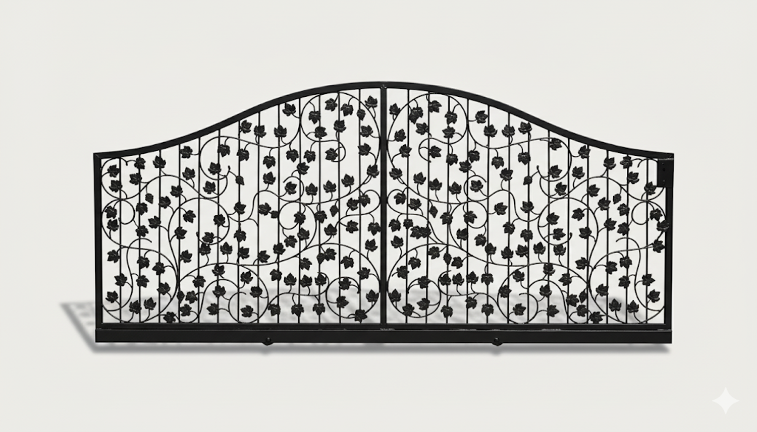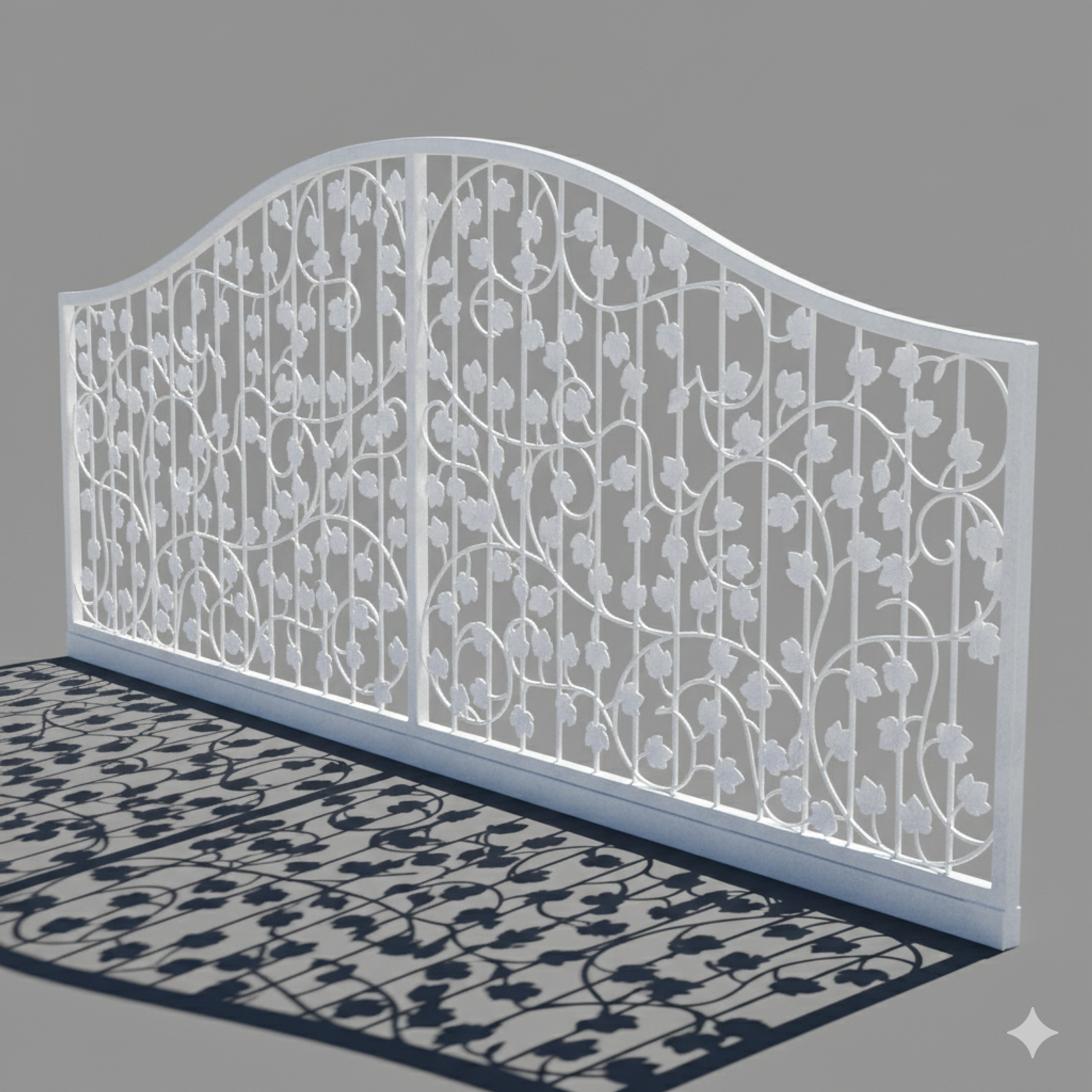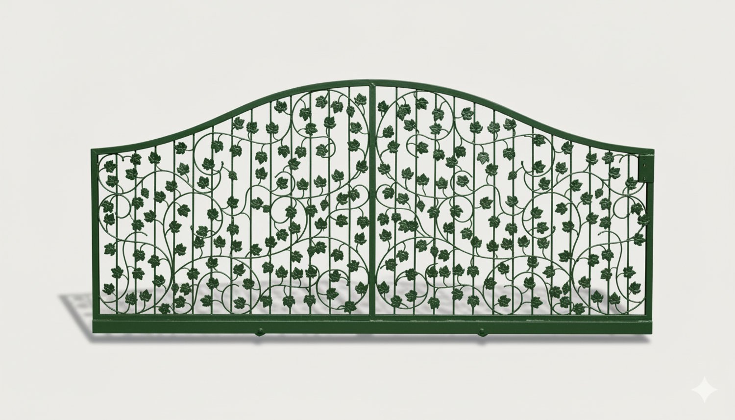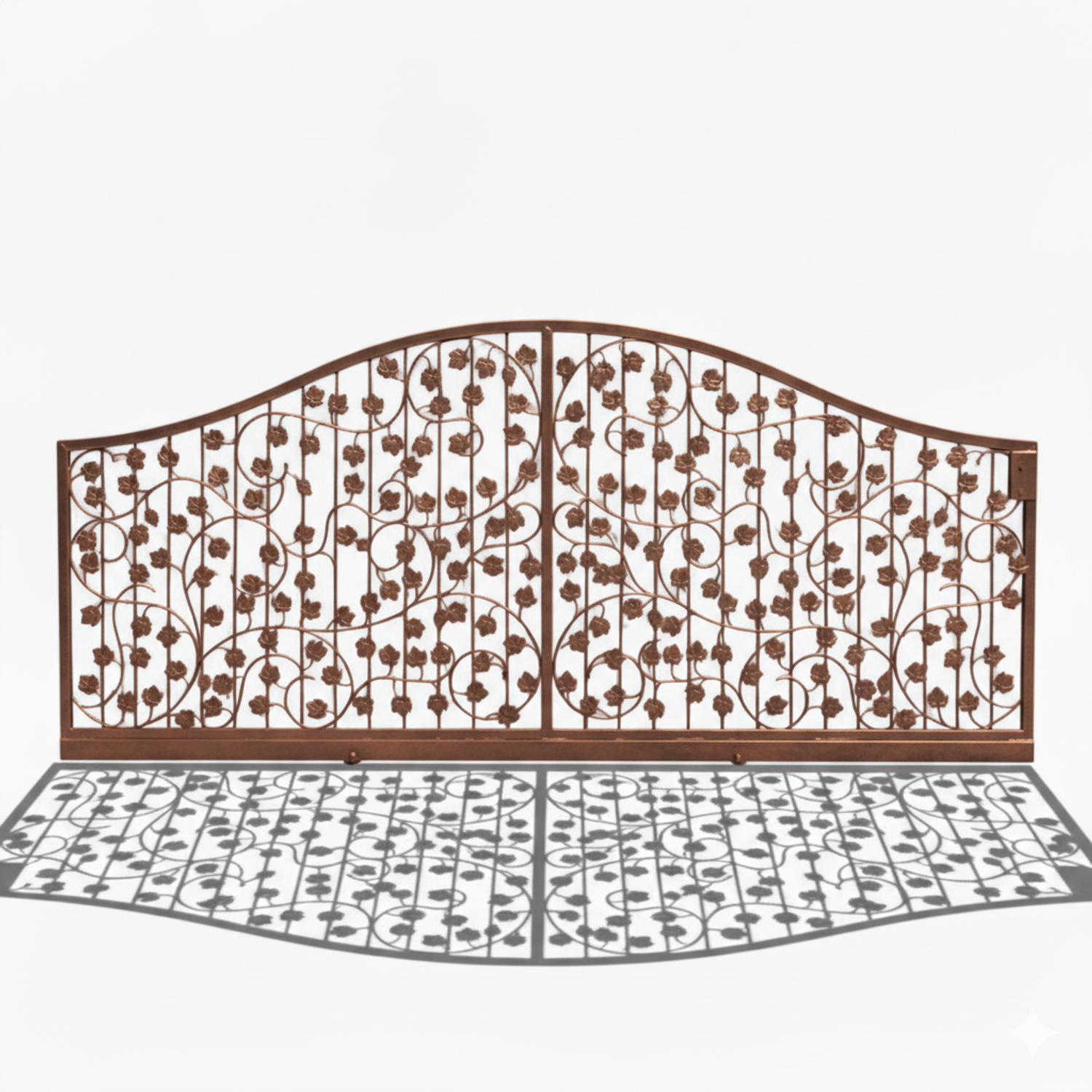 Dekoratives Eisenwerk mit filigranen Metallblech-Elementen künstlerisch aufwendig und sauber von Hand gearbeitet. Beeindruckende Gesamterscheinung mit Dominanz der stilisierten Blätter und Weinreben. Schwungvoll harmonisch wirkt auch der obere Rundbogen. Besonders aufwendig und auffällig sind die filigranen geschmiedeten Weinstöcke aus Rundeisen mit geschmiedeten Enden.