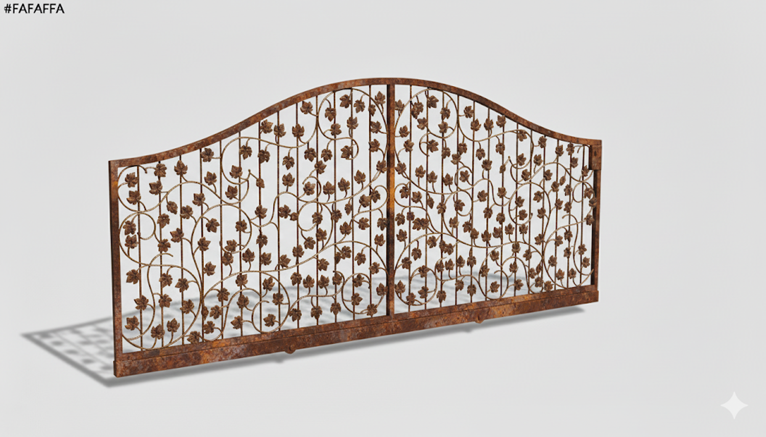 Dekoratives Eisenwerk mit filigranen Metallblech-Elementen künstlerisch aufwendig und sauber von Hand gearbeitet. Beeindruckende Gesamterscheinung mit Dominanz der stilisierten Blätter und Weinreben. Schwungvoll harmonisch wirkt auch der obere Rundbogen. Besonders aufwendig und auffällig sind die filigranen geschmiedeten Weinstöcke aus Rundeisen mit geschmiedeten Enden.