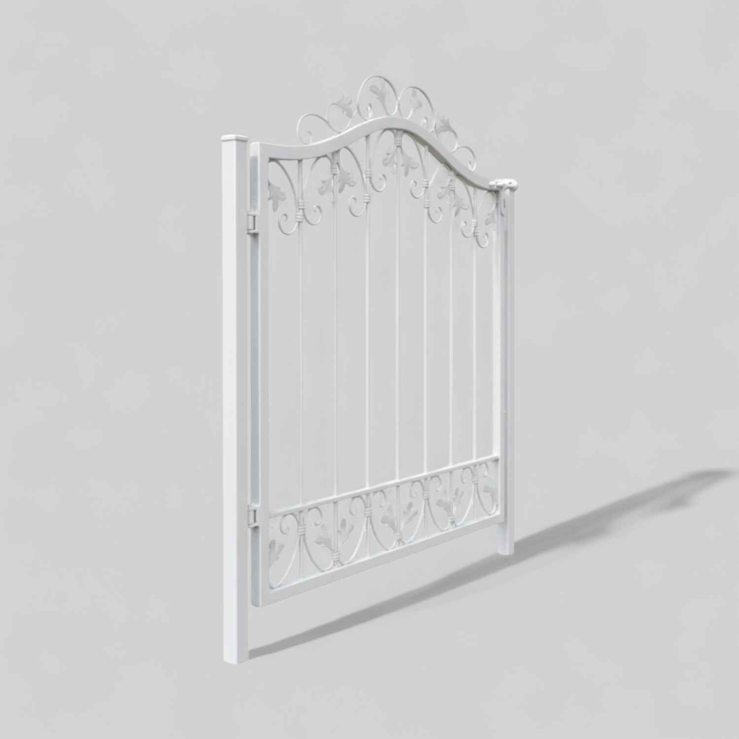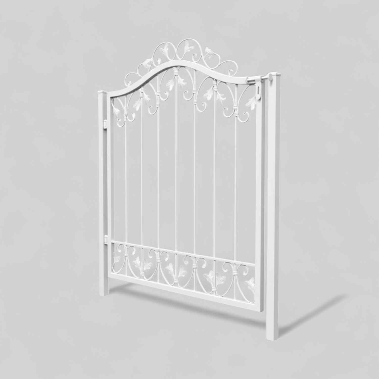 Aufwendige Handarbeit: Harmonischer Rundbogen: Leichte Barockschnecken; teils handgeschmiedet mit Tiefziehblättern; Aufwendige geriffelte Zierbundung