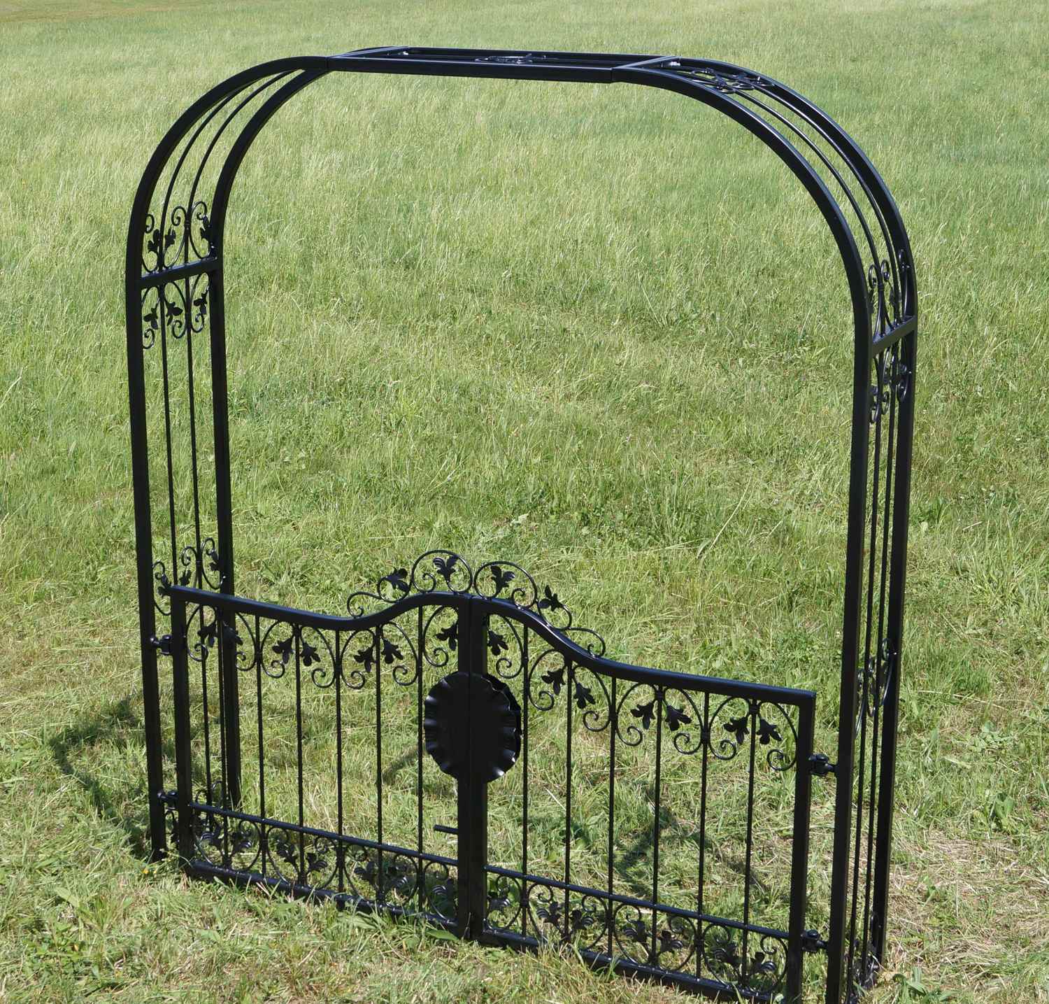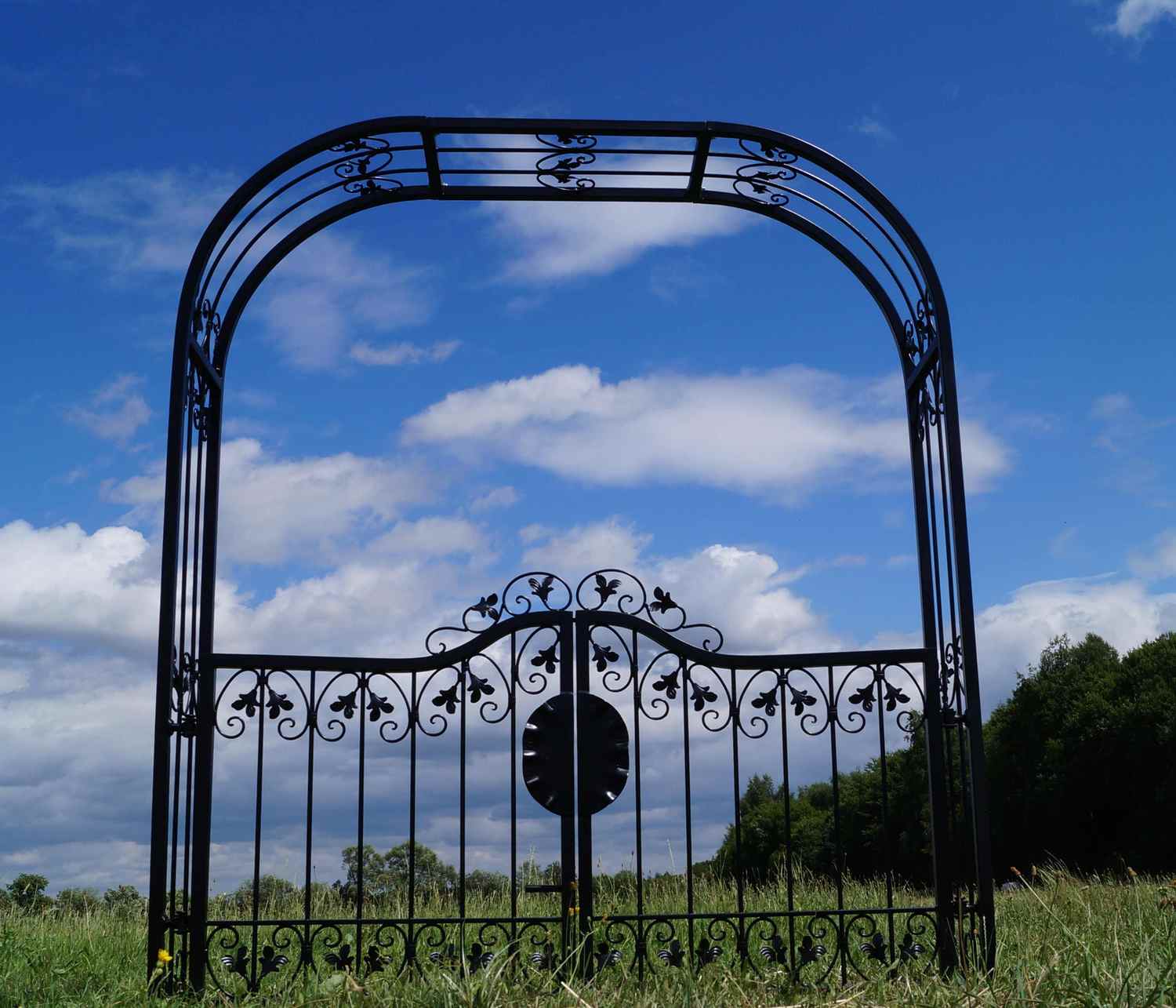 Rundbogen Rosenbogen und Gartentür aus Kastenrohr und dekorativem Rundbogen.