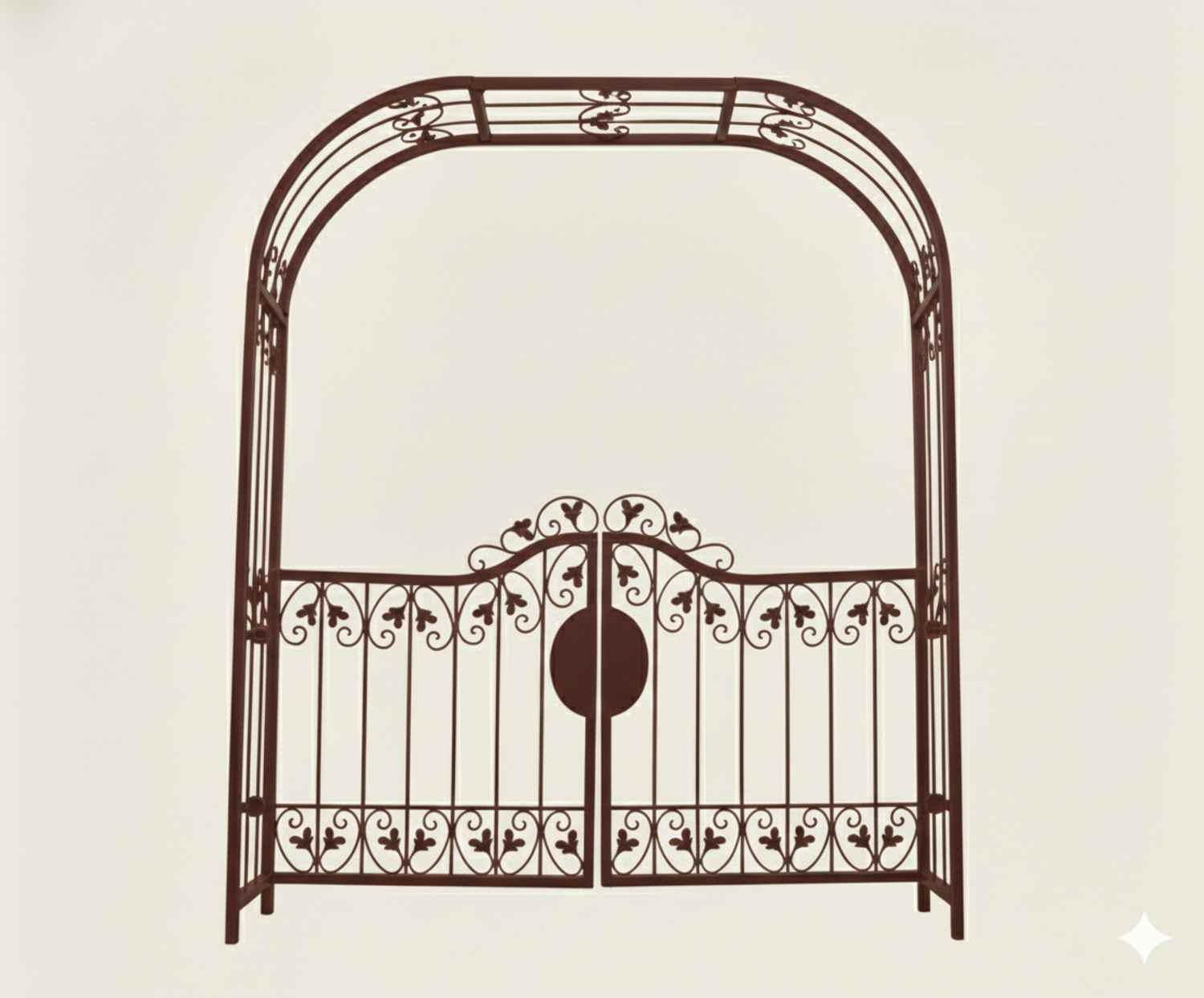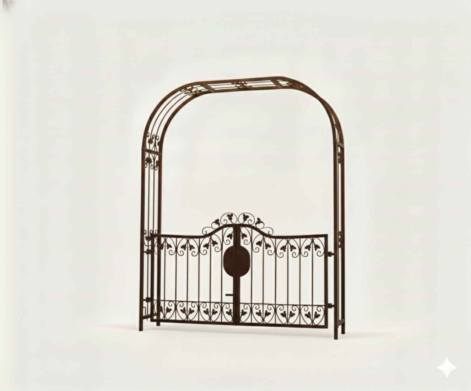 Rosenbogen mit Tür Monaco-RBGT-RBS 170/220, GABELLA™ solide Marken-Qualität, hochwertige Handarbeit vom Hersteller, Monaco: Aufwendige Füllung mit leichten Barockschnecken Schmiedeeisen, C-Schnecke von Hand ausgeschmiedet mit Tiefziehblättern, aufwendig geriffelte Zierbundung.