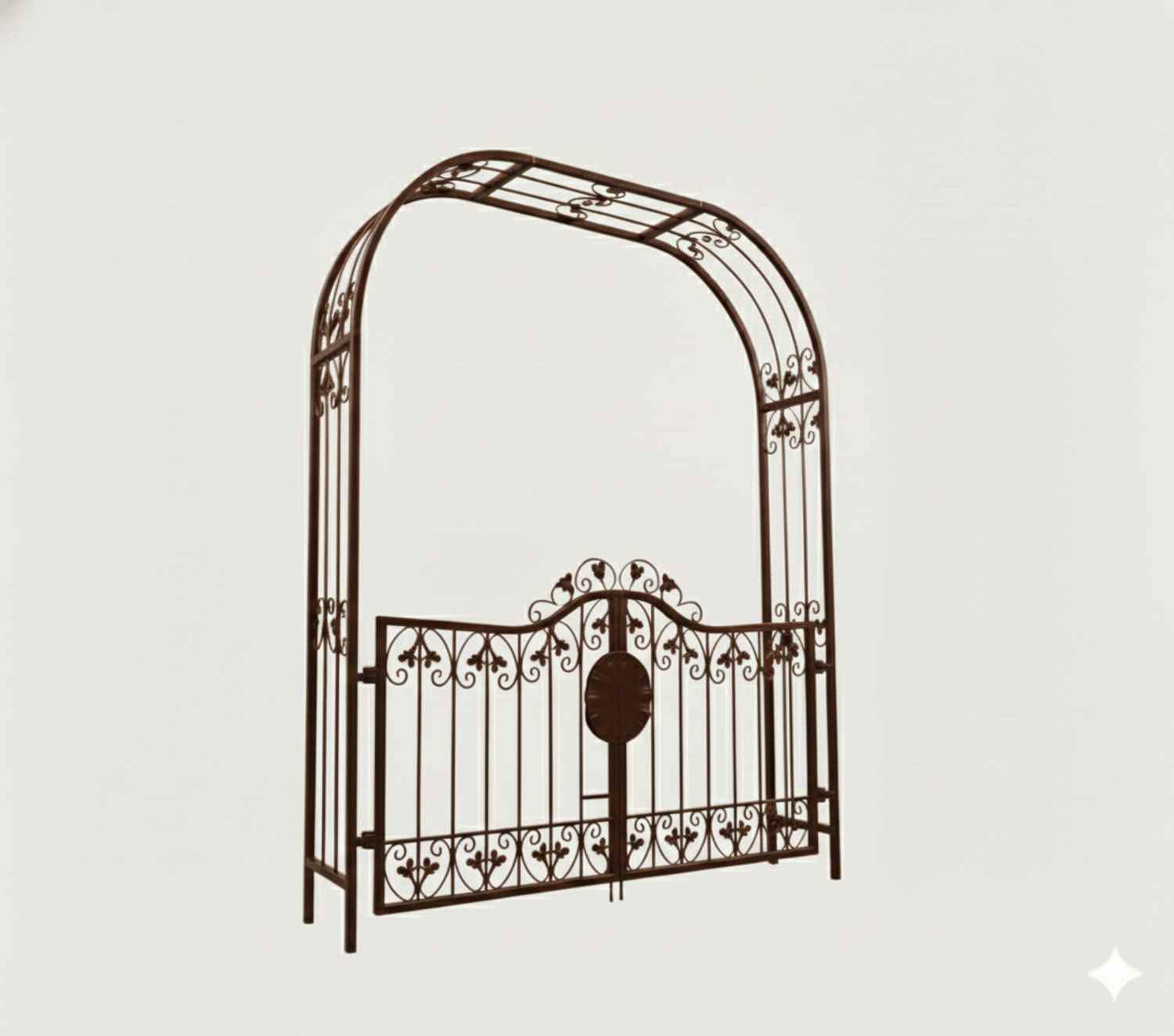 Rundbogen Rosenbogen und Gartentür aus Kastenrohr und dekorativem Rundbogen.